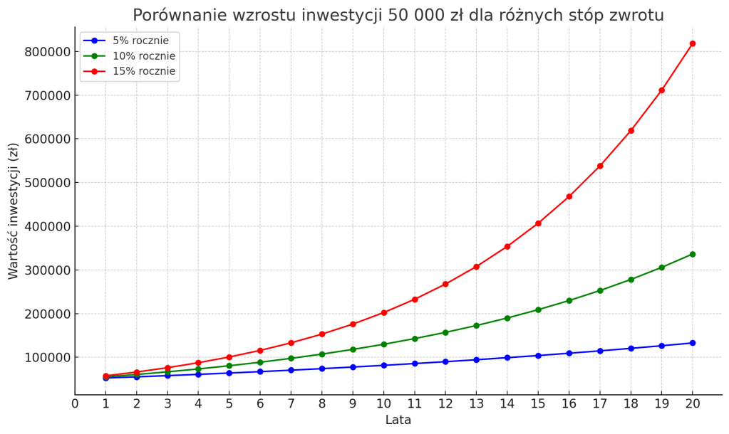 Inwestowanie 50 000 zł z roczną stopą zwrotu 10% przez 20 lat może przynieść ponad 336 000 zł. Przy 15% rocznie — nawet ponad 800 000 zł.
