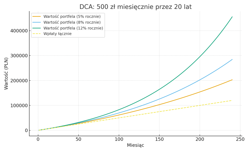 Siła regularności: DCA na 500 zł miesięcznie (10–20 lat)